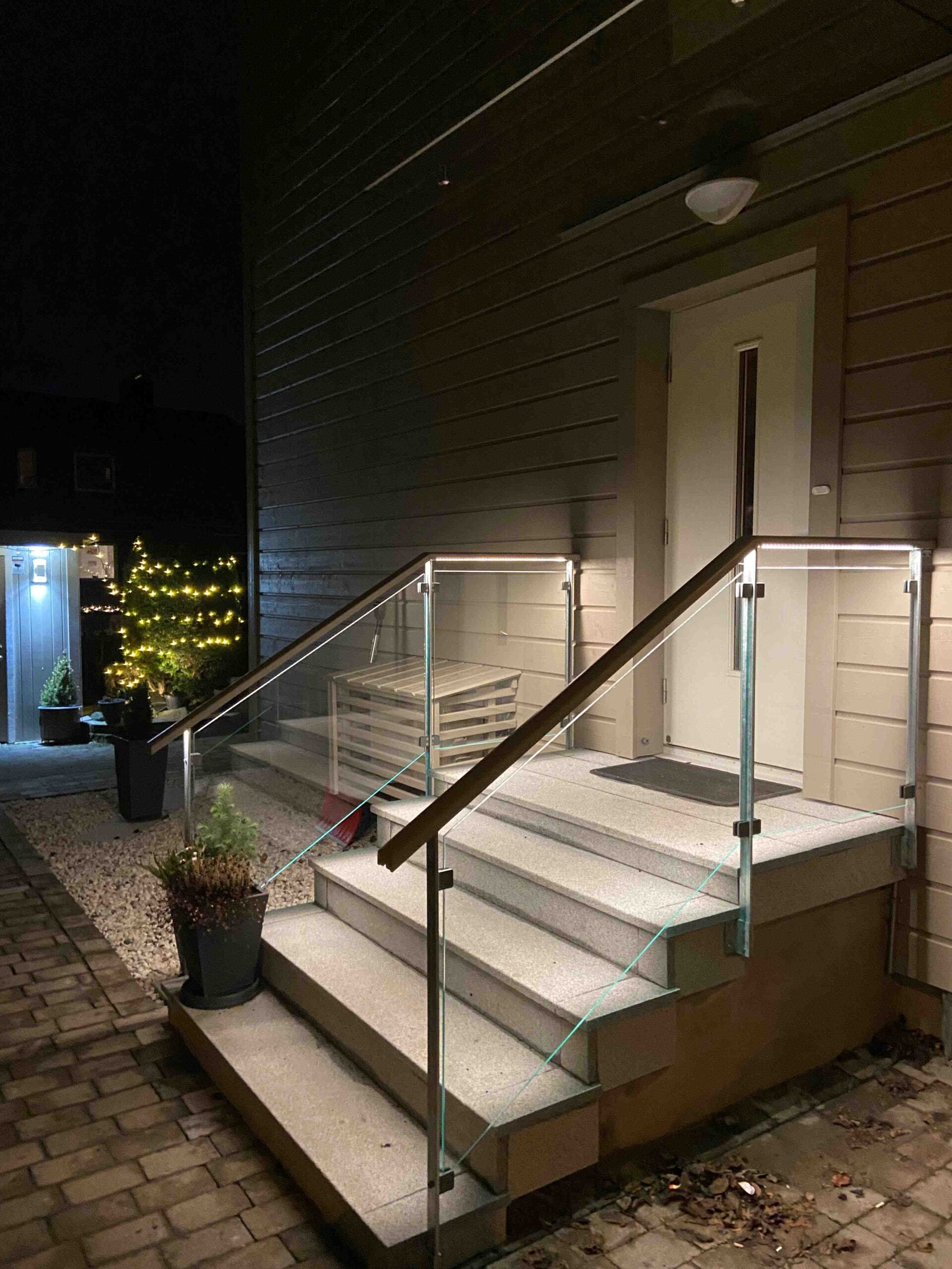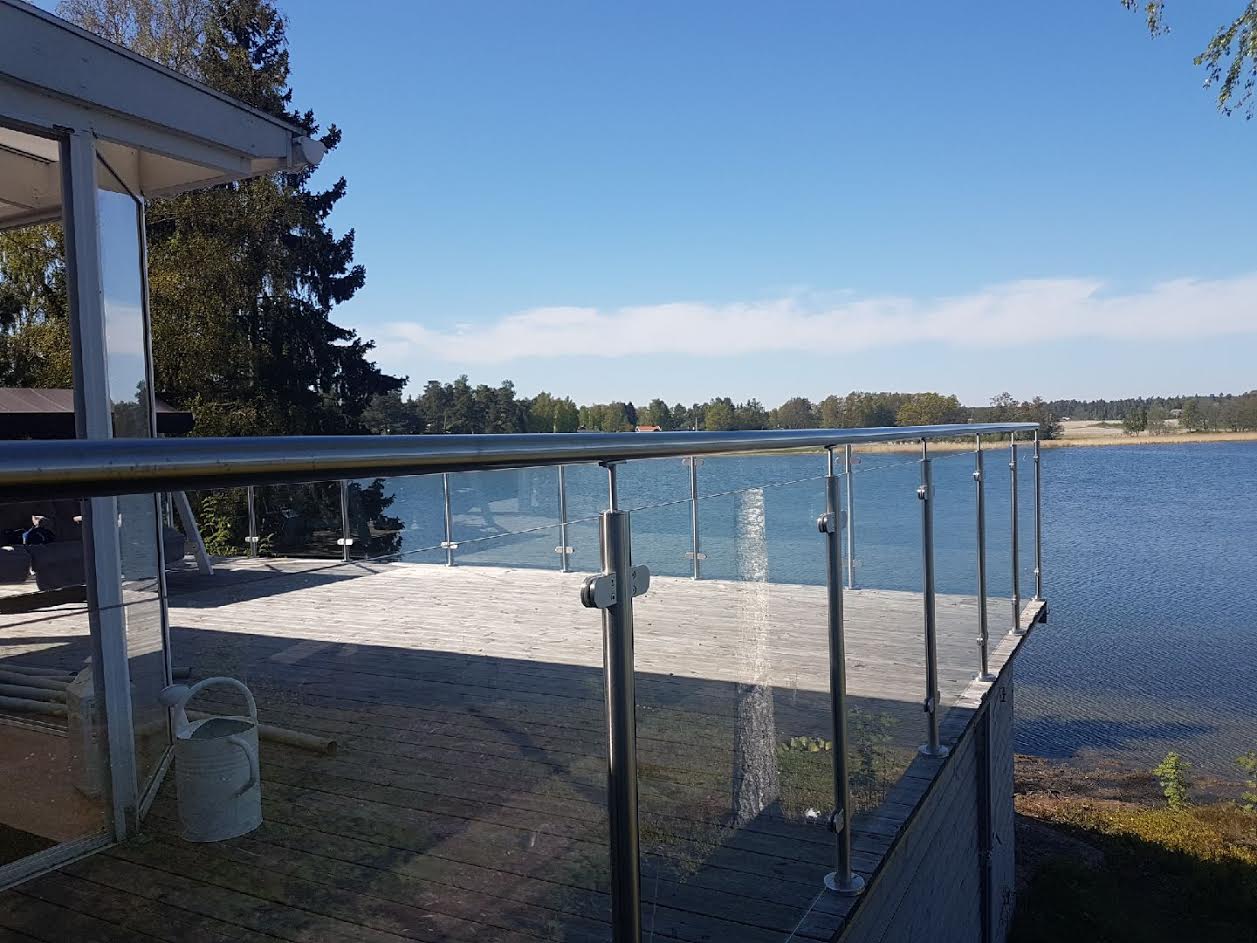 I priserna ingår skenor, färdiga hörn, täcklock till ändar samt måttanpassade härdade och laminerade klara 12,76 mm glas för en höjd på räcket om 1 100 mm.