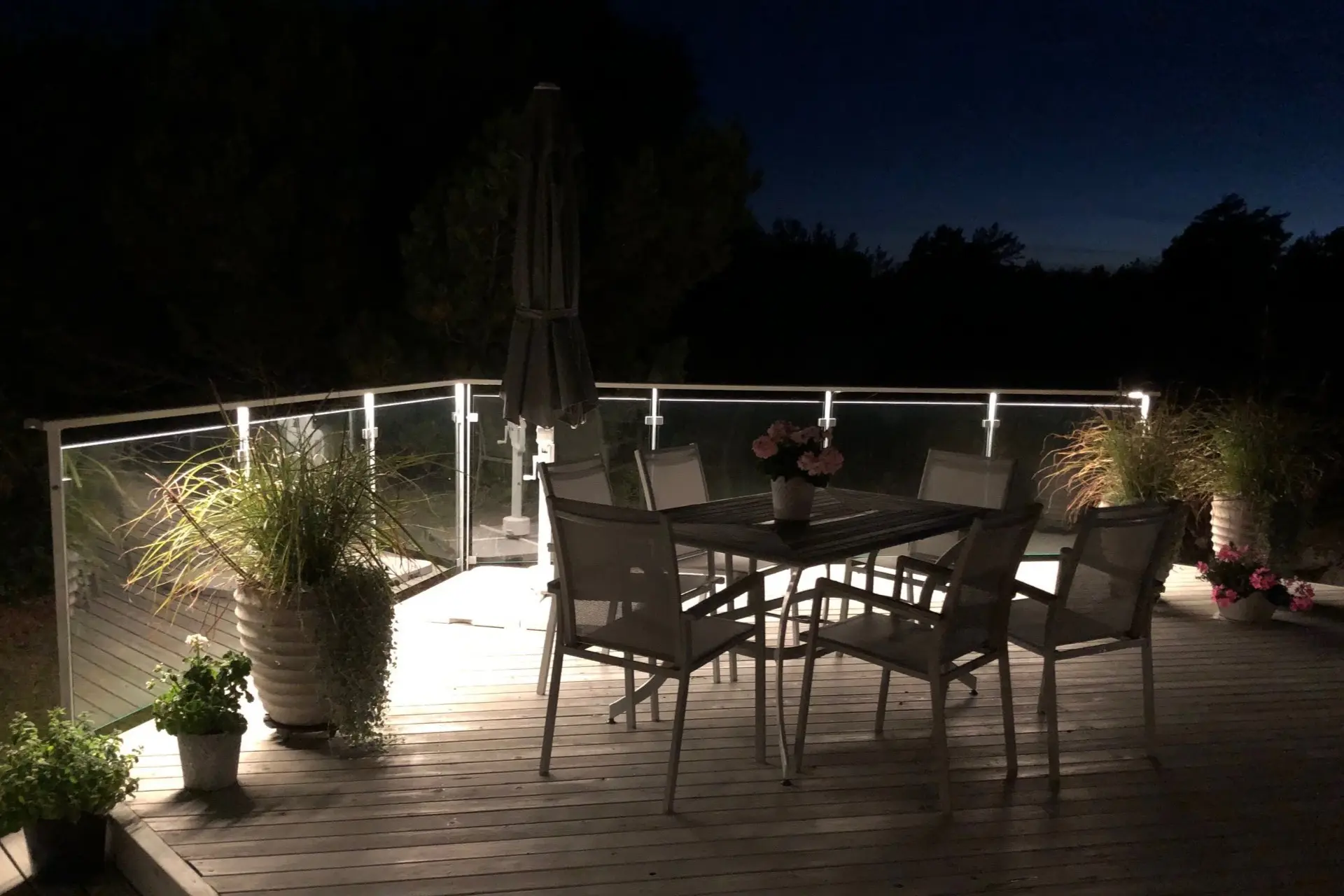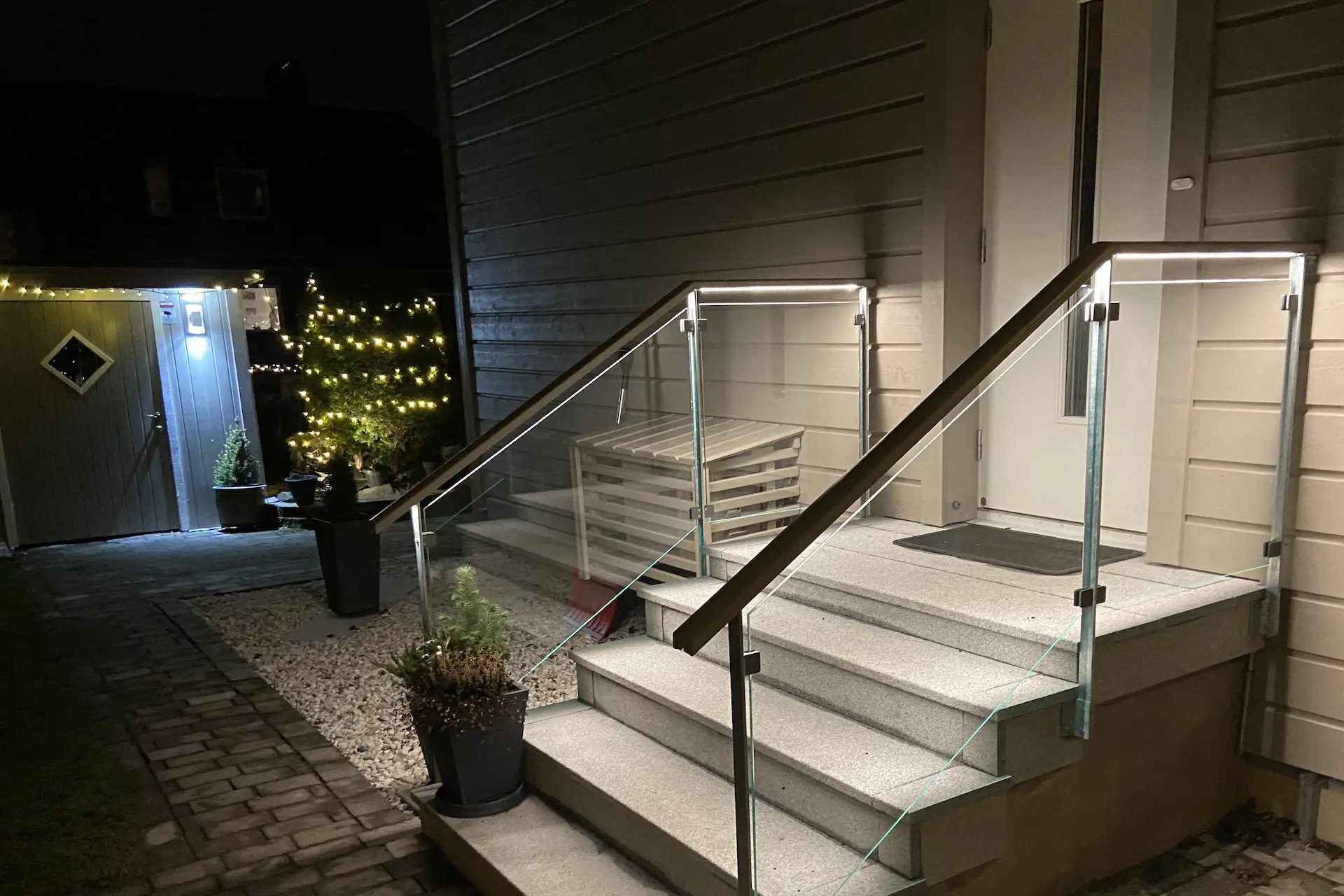 Våra överliggare i trä till våra glasräcken med varmgalvade stolpar är förberedda för att fälla in LED-belysning.